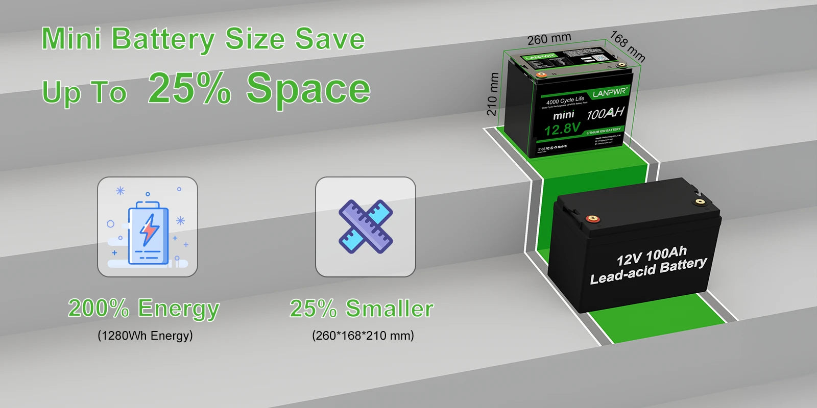 • Compact & lightweight: L260 × W168 × H210 mm, approx. 9.8 kg — 75% the size and 200% the energy of a 12V 100Ah lead-acid battery.
