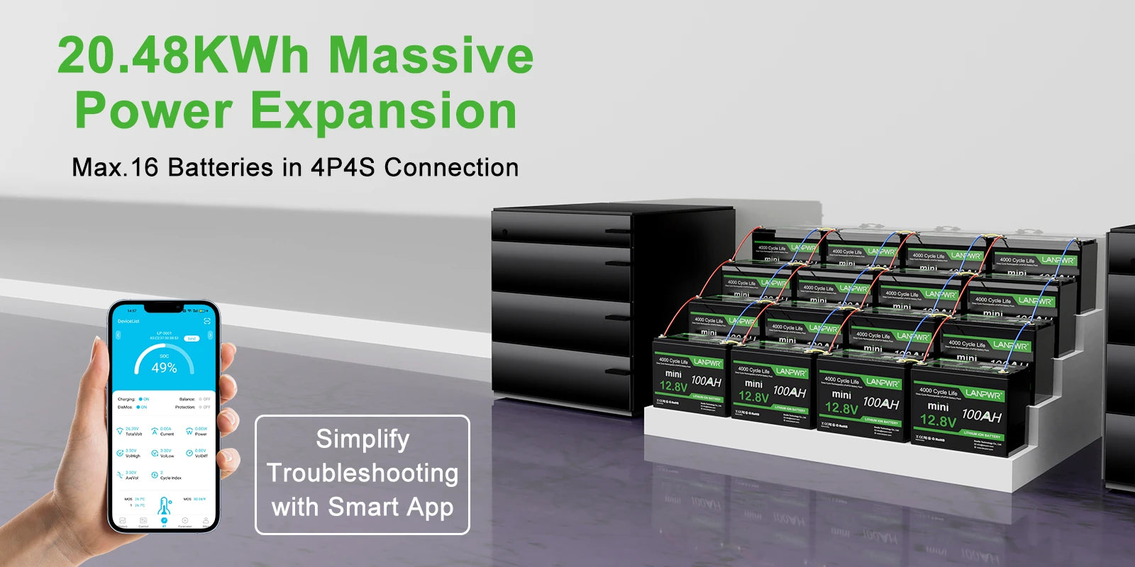 【Versatile and Expandable】LANPWR 12V 100Ah Mini Bluetooth LiFePO4 battery supports configurations up to 4S4P, enabling a robust 48V 400Ah system that delivers 20.48kWh energy and 20.48kW power. Ideal for RVs, solar installations, home energy storage, and off-grid applications, it offers versatile power solutions.