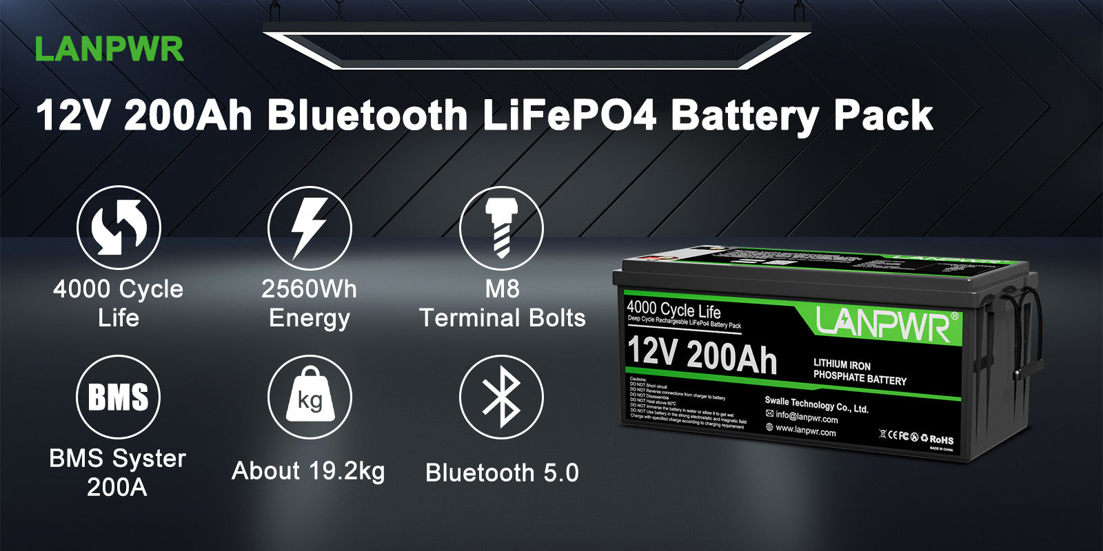 LANPWR 12V 200Ah Plus LiFePO4 Battery with Bluetooth 5.0, Maximum Load Power 2560W, 2560Wh Energy
