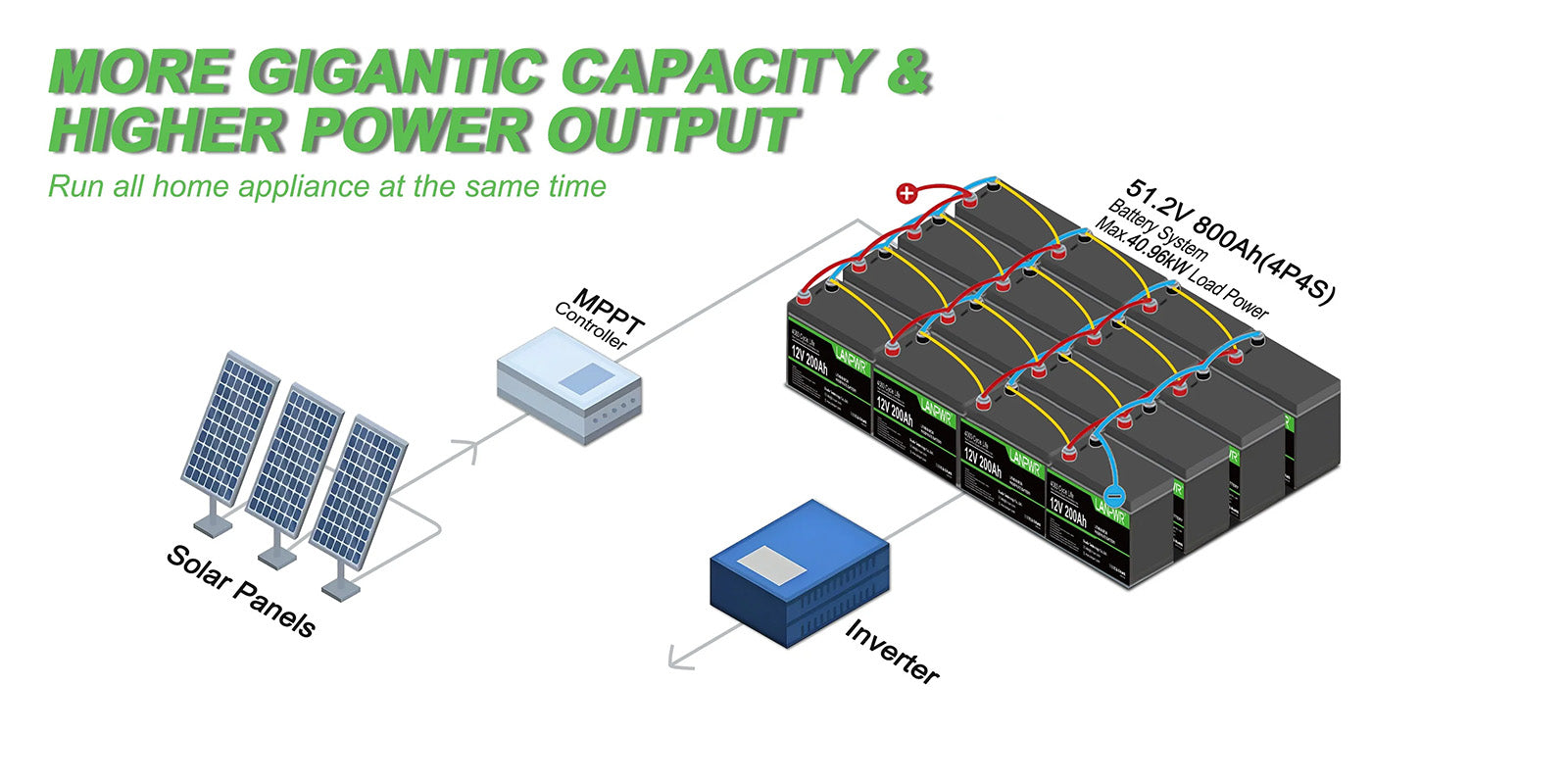 【Versatile and Expandable】The 12V 200Ah Plus LiFePO4 battery supports configurations up to 4S4P, enabling a robust 48V 800Ah system that delivers 40,96kWh energy and 40,96kW power. Ideal for RVs, solar installations, home energy storage, and off-grid applications, it offers versatile power solutions.