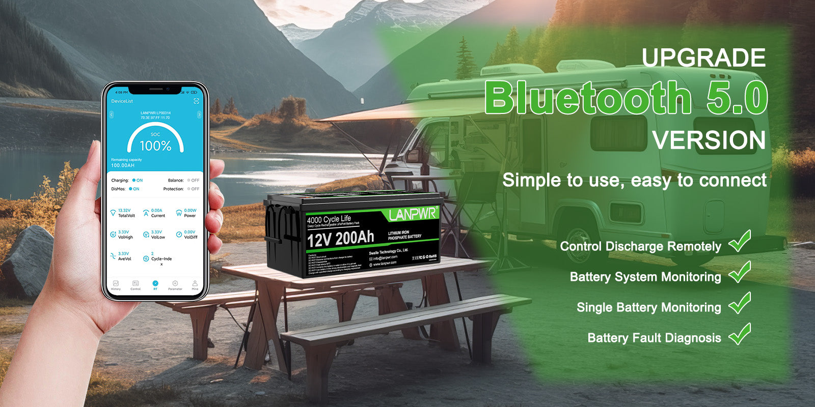 🔥Bluetooth Real-Time Monitoring: Meet new LANPWR 12V 200Ah Plus LiFePO4 battery featuring Bluetooth 5.0. Now you can check the status of battery voltage, current and capacity at any time from your phone. Also you'll be able to keep a close eye on the battery remaining working life. Stay confident and focused on every fishing trip without worrying about unexpected power loss