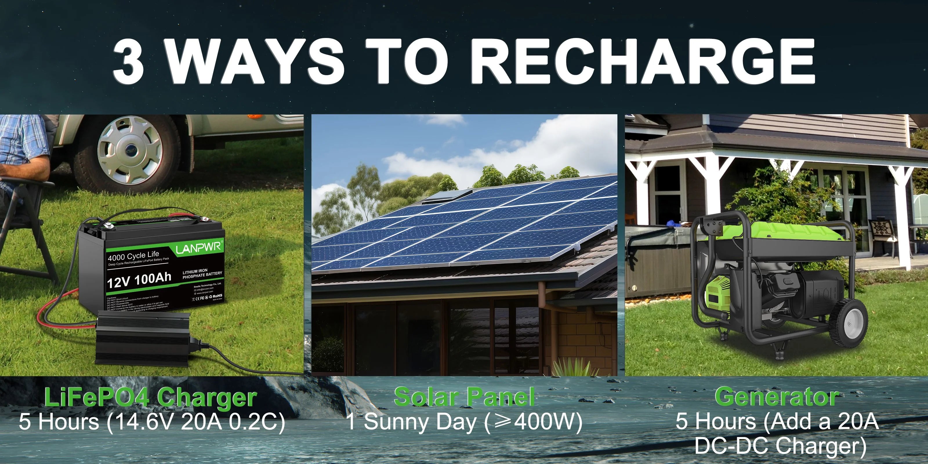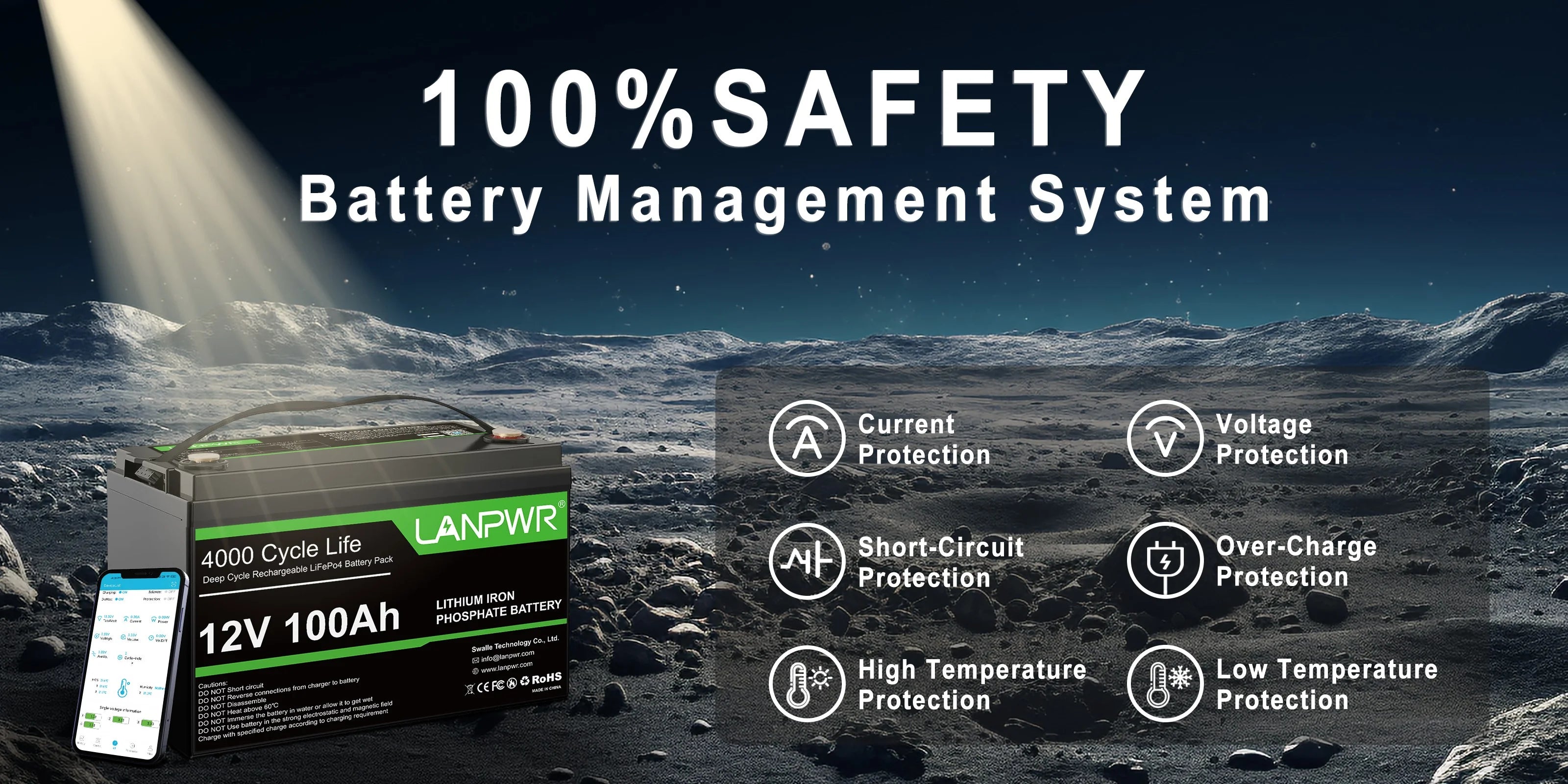 【Comprehensive Protection】With a 100A BMS, the Lanpwr battery provides full protection against overcharge, deep discharge, over-current, overheating, and short circuits, all while boasting an IP65 waterproof rating. Its low self-discharge rate ensures reliable performance in both indoor and outdoor settings.