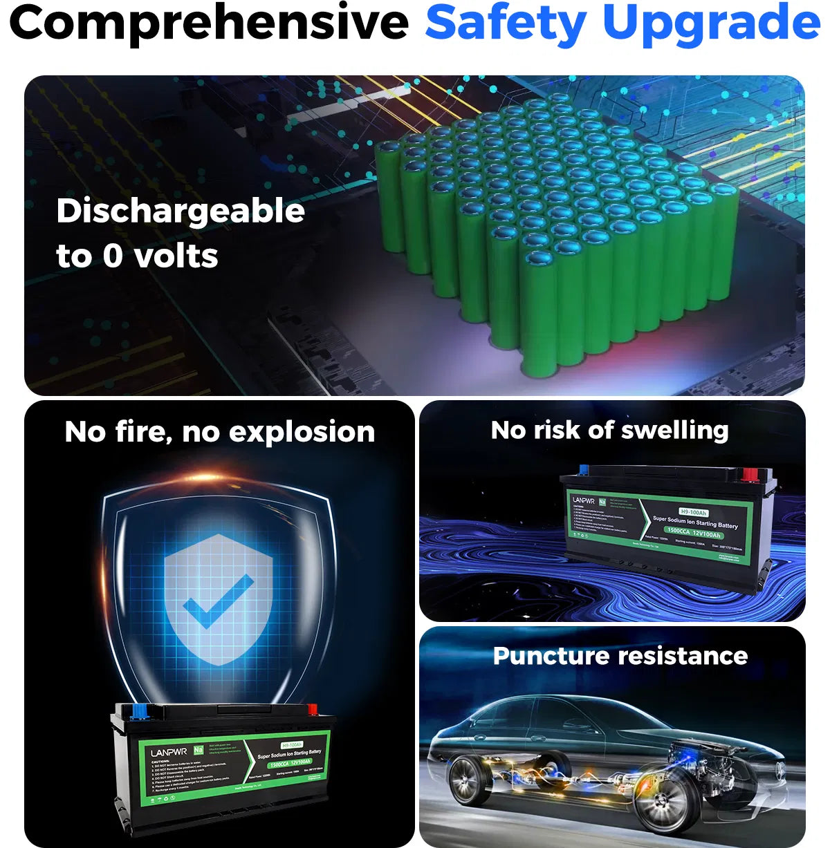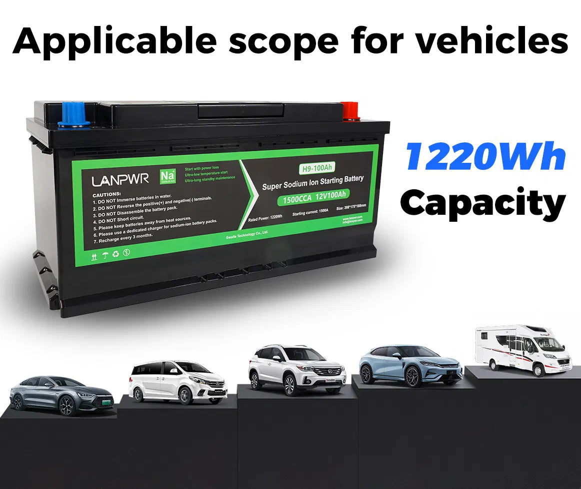 The LANPWR 12V 100Ah Sodium-ion Battery Pack, with an impressive 1500 Cold Cranking Amps (CCA), offers reliable and powerful starting performance for both car and marine applications. Its compact size and lightweight design ensure improved vehicle efficiency and performance.