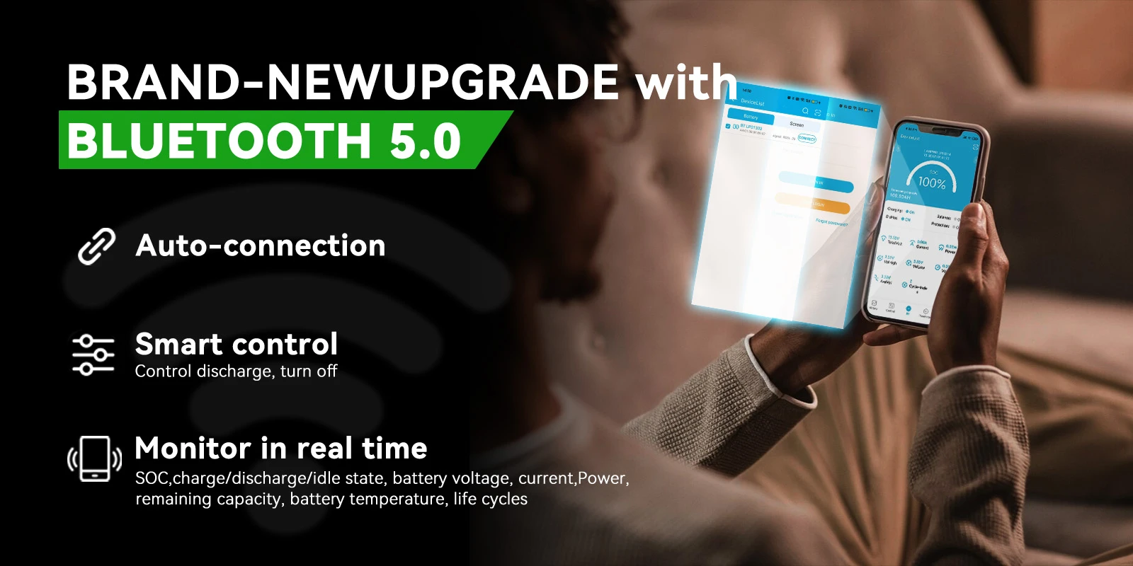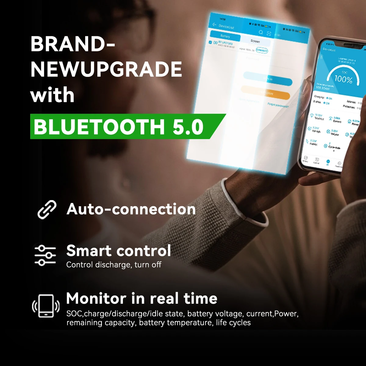 The Bluetooth monitoring feature connects the battery to a smartphone app (iOS/Android). It allows you to: