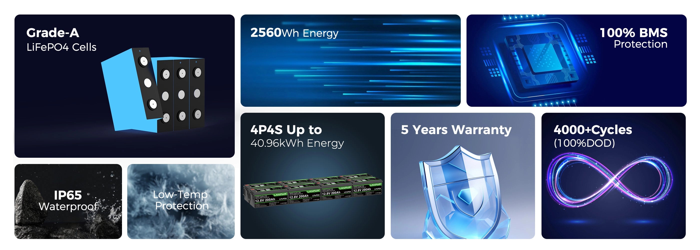 【Multi-Application】Because lithium batteries can be simply and easily connected in series and parallel as you need, 12V 200AH Plus LiFePO4 batteries are perfect for off-grid solar systems and outdoor applications such as home backup power, RVs, camping, sailboats, and more.