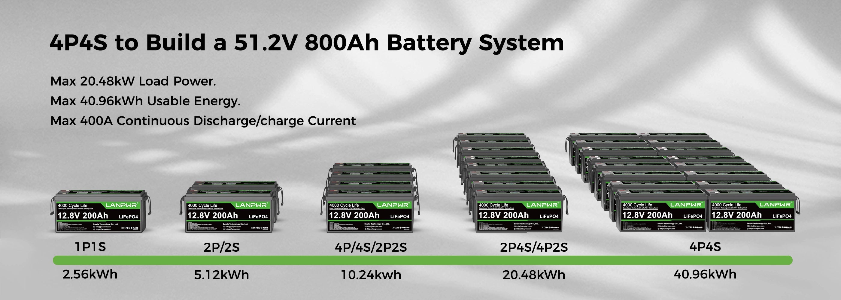 【Versatile and Expandable】The 12V 200Ah Plus LiFePO4 battery supports configurations up to 4S4P, enabling a robust 48V 800Ah system that delivers 40,96kWh energy and 40,96kW power. Ideal for RVs, solar installations, home energy storage, and off-grid applications, it offers versatile power solutions.