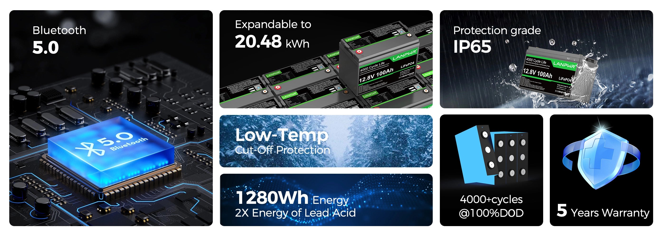 LANPWR 12V 100Ah LiFePO4 Battery with Bluetooth 5.0, 4000+ Deep Cycle Lithium Battery