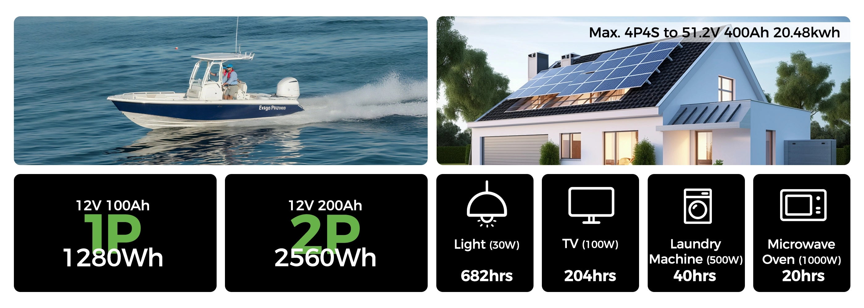 【Versatile and Expandable】The 12V 100Ah LiFePO4 battery supports configurations up to 4S4P, enabling a robust 48V 400Ah system that delivers 20.48kWh energy and 20.48kW power. Ideal for RVs, solar installations, home energy storage, and off-grid applications, it offers versatile power solutions.