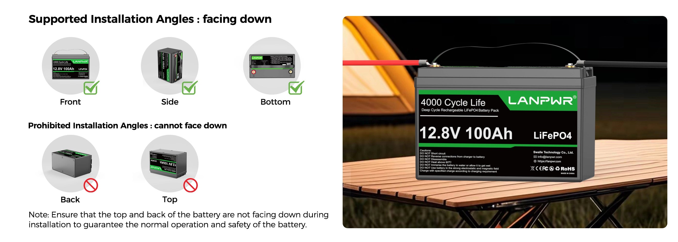 【Comprehensive Protection】With a 100A BMS, the Lanpwr battery provides full protection against overcharge, deep discharge, over-current, overheating, and short circuits, all while boasting an IP65 waterproof rating. Its low self-discharge rate ensures reliable performance in both indoor and outdoor settings.